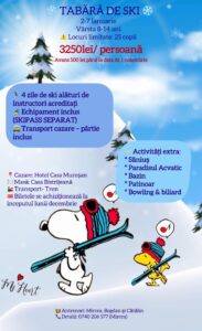 Iarna aceasta, dăm startul primei ediții a taberei de schi „Primii Pași pe Zăpadă”, dedicată copiilor dornici să descopere magia sporturilor de iarnă. Sub îndrumarea unor instructori experimentați, participanții vor învăța bazele schiatului într-un cadru sigur, prietenos și plin de voie bună. Pe lângă lecțiile de pe pârtie, copiii se vor bucura de activități recreative, jocuri în zăpadă și seri tematice. Scopul taberei este de a le insufla celor mici încredere, spirit de echipă și dragoste pentru munte. O experiență de neuitat îi așteaptă pe toți micii aventurieri ai iernii!